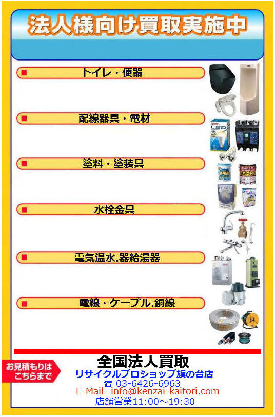 不要になった水栓金具、水栓部品、電気温水器、水栓、建材、洗面、トイレ便器、システムキッチン、ユニットバス、床暖房、給湯器、風呂 見積り査定無料、キャンセル料もかかりません倉庫の整理で出てきた、 リサイクルショップでは引き取ってもらえないような特殊建材も買取OK!