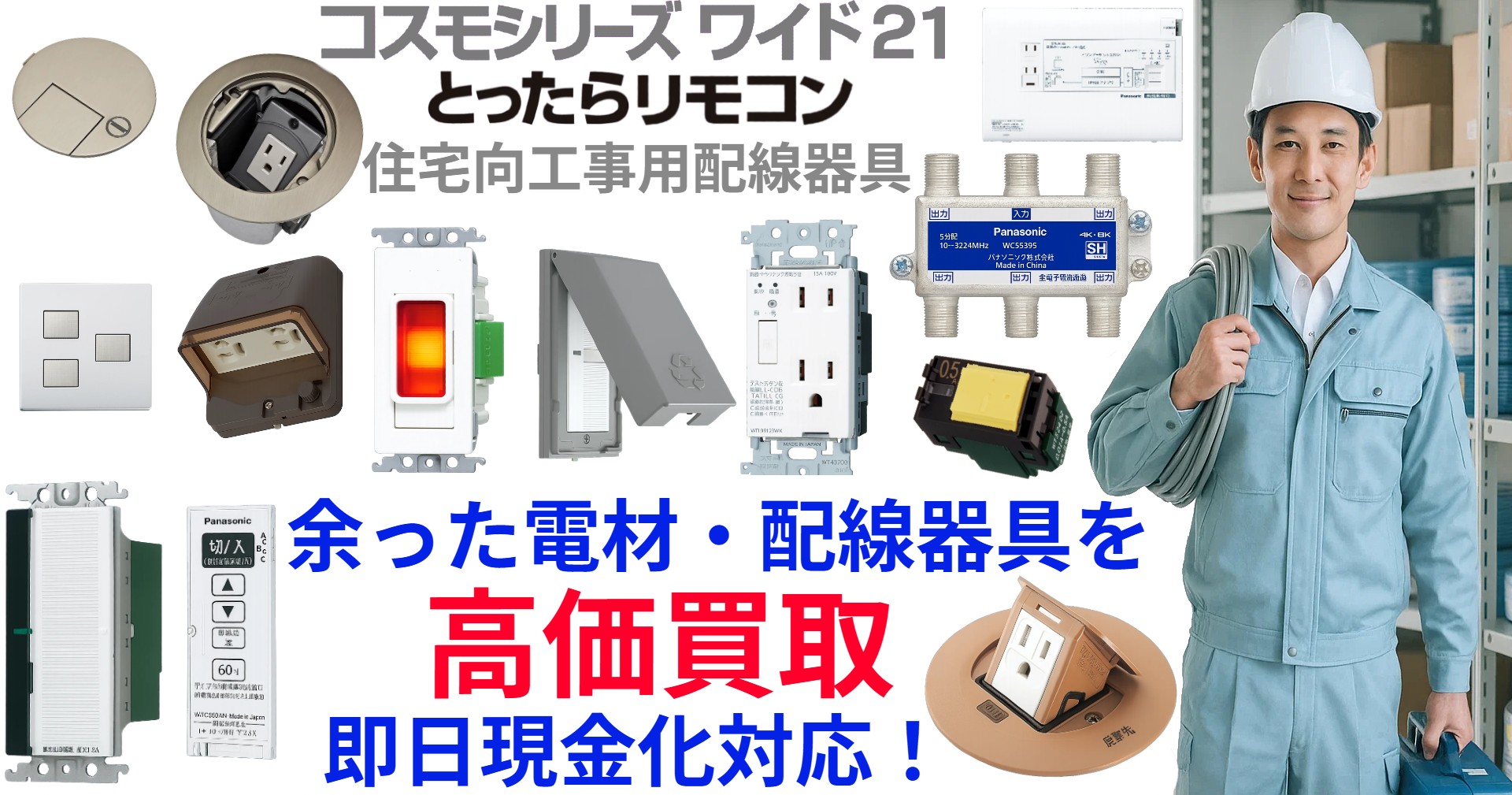 倉庫や現場に眠る パナソニック コスモシリーズ ワイド21、住宅向工事用配線器具・屋側用配線器具・各種スイッチ・コンセント・プレート 未使用・未開封品なら どこよりもを高価買取しております。法人様・電材卸業者様・設備業者様など、在庫整理や余剰品の現金化をご検討の方はぜひご相談ください。 在庫整理・現場変更・モデルチェンジ対応の買取は、リサイクルプロショップにお任せください。